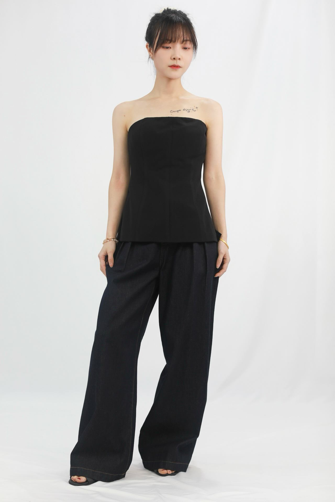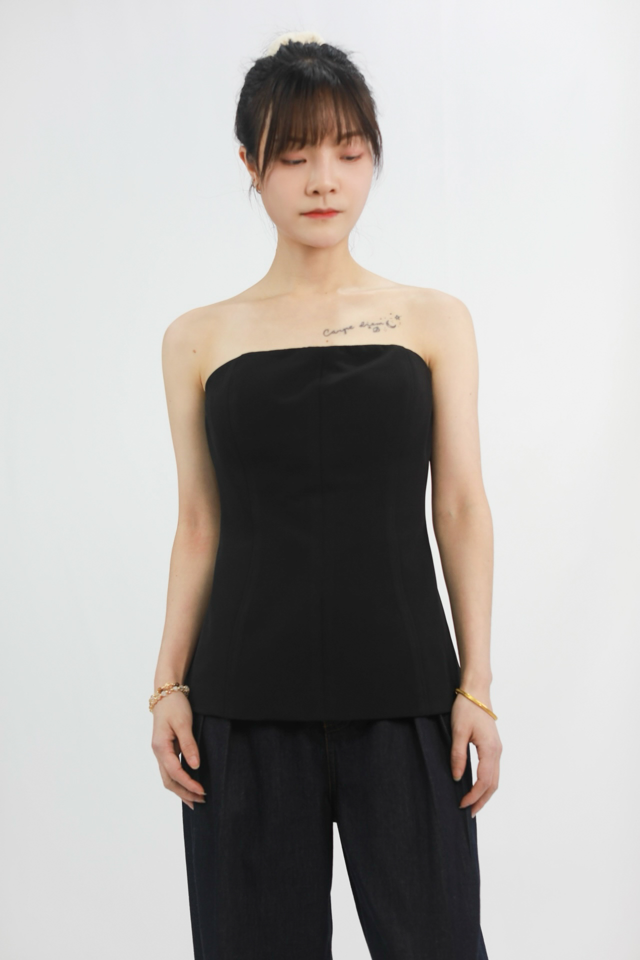 This black strapless custom top is designed to highlight personality and showcase bold elegance. This shoe features clean, structured contours and subtle contour seams that tightly embrace the body in all appropriate places, creating a stylish and exquisite appearance.