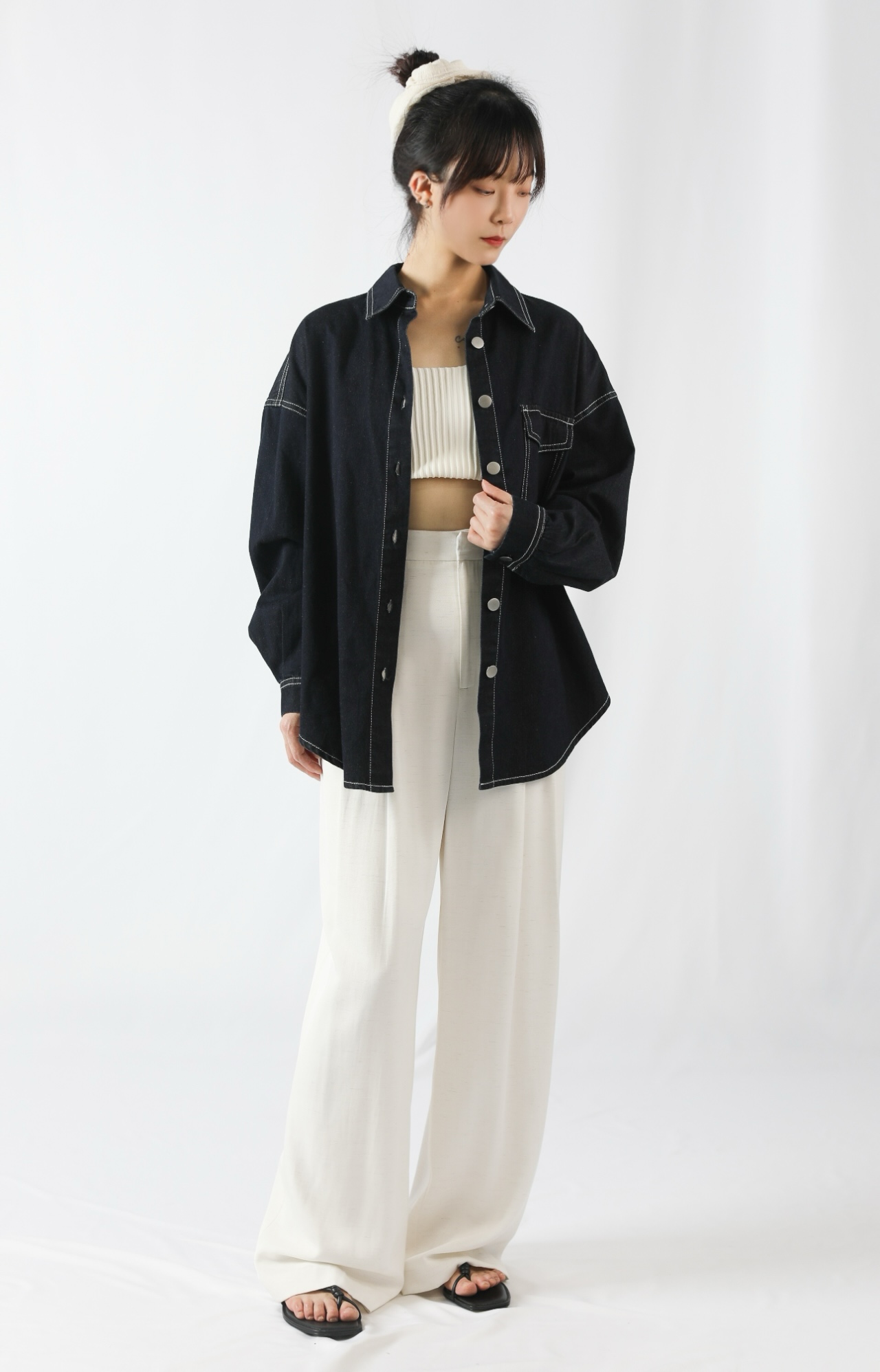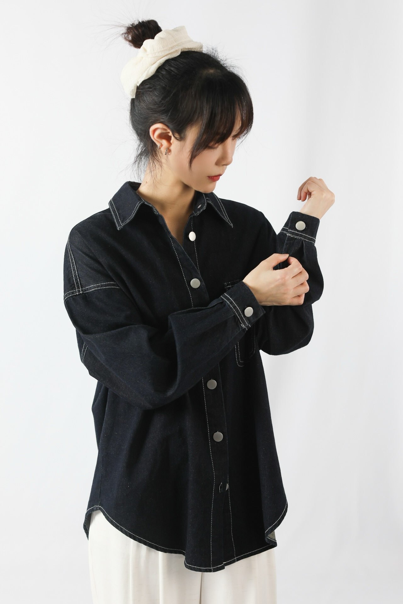 This top is a dark denim shirt with a strong sense of design, blending retro and minimalist styles, suitable for daily commuting or casual wear.