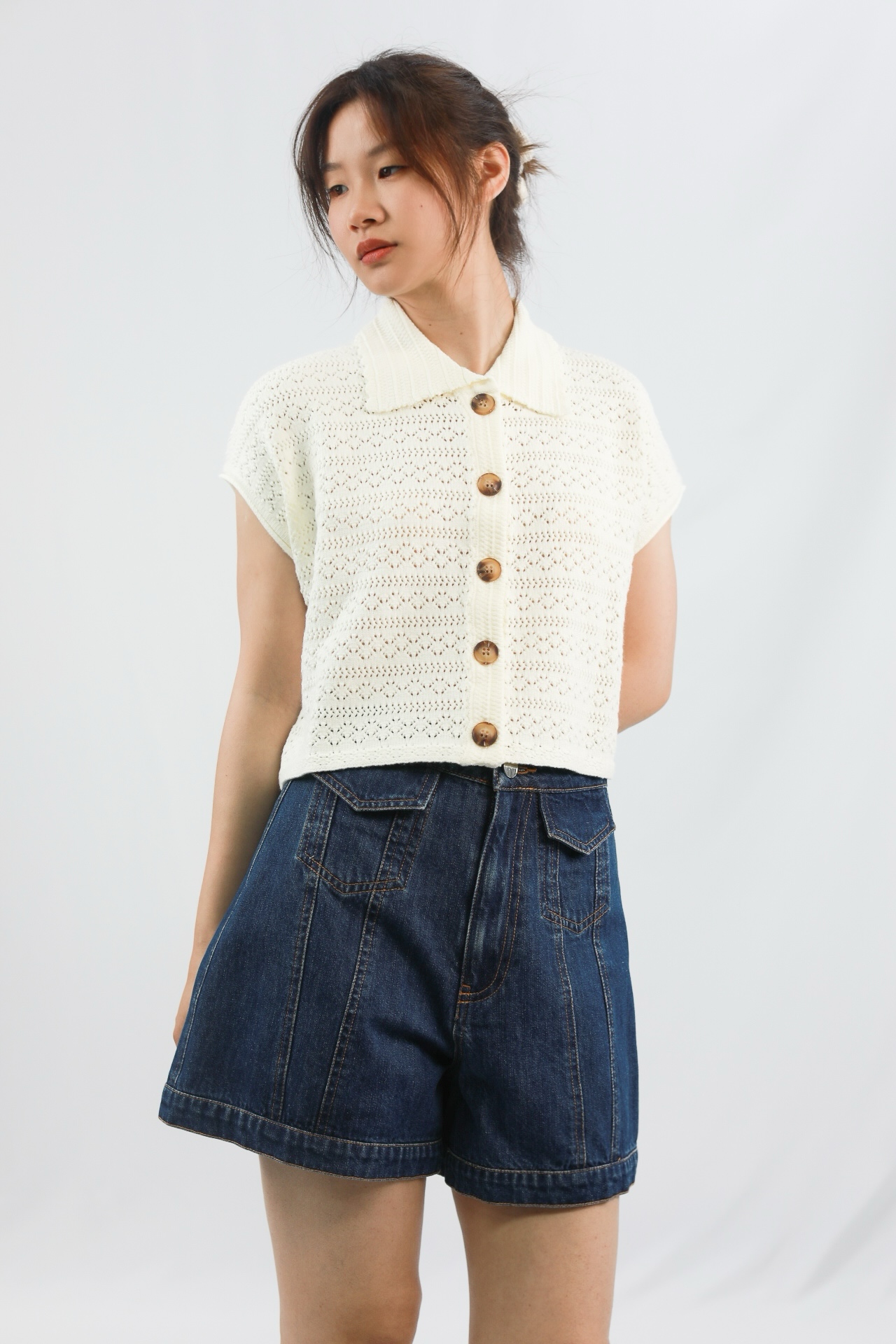 这是一款米白色无袖镂空针织开衫,采用短款设计,前襟配有复古木质纽扣,领口为小翻领,整体风格温柔复古,适合春夏季节单穿或作为外搭。搭配高腰牛仔裤,凸显腰线,营造随性又精致的法式氛围感。