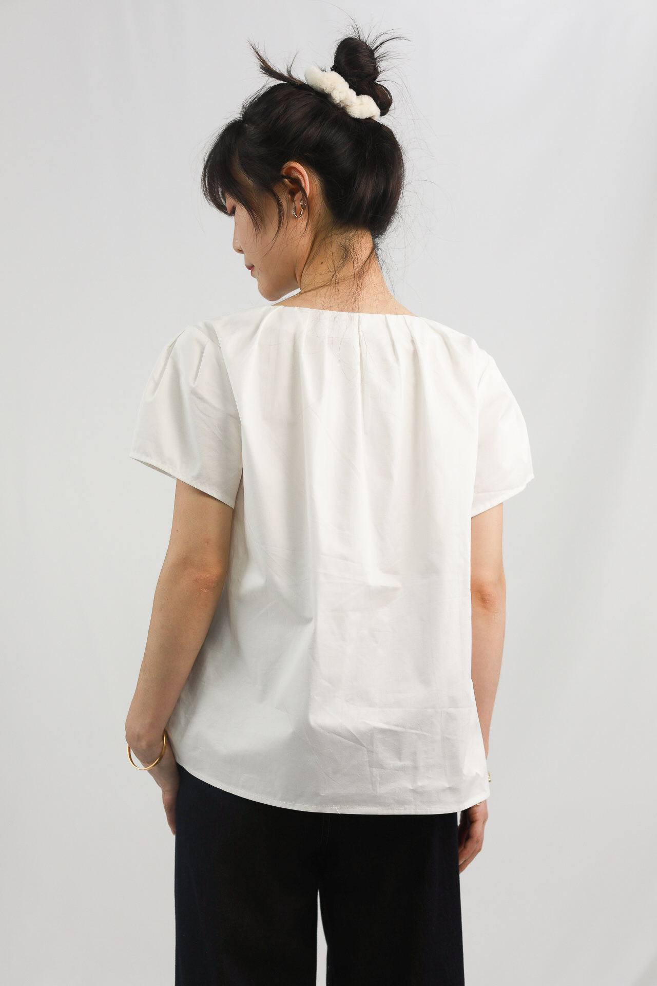 这是一件法式复古风格的白色圆领短袖上衣,设计简约而不失细节,非常适合日常通勤或休闲穿搭。从正面看,它采用单排金属纽扣装饰,领口处有轻微褶皱设计,增添柔美感;背面同样保留了圆领与短袖的利落线条,整体剪裁宽松舒适,能很好地修饰身形。