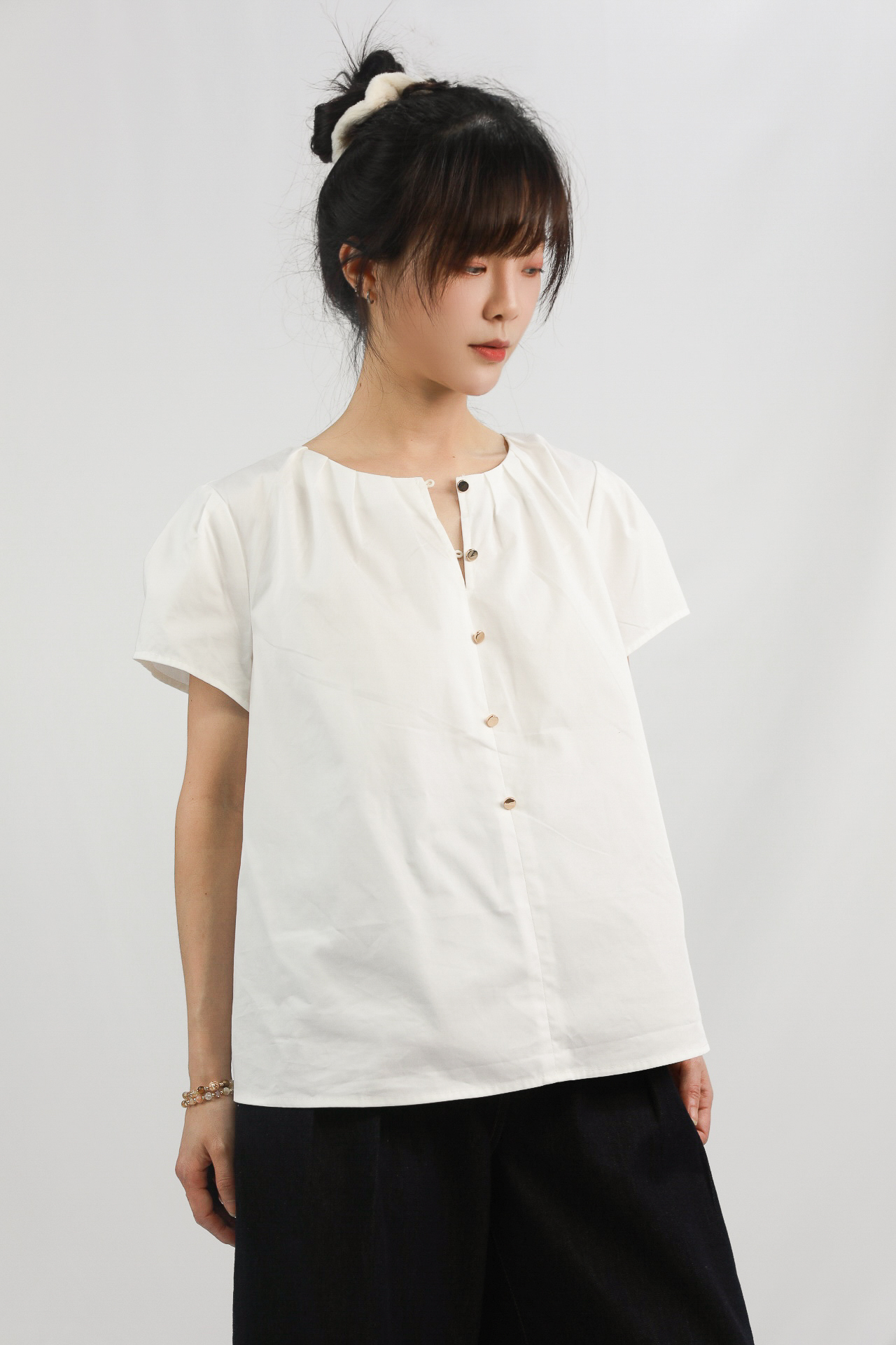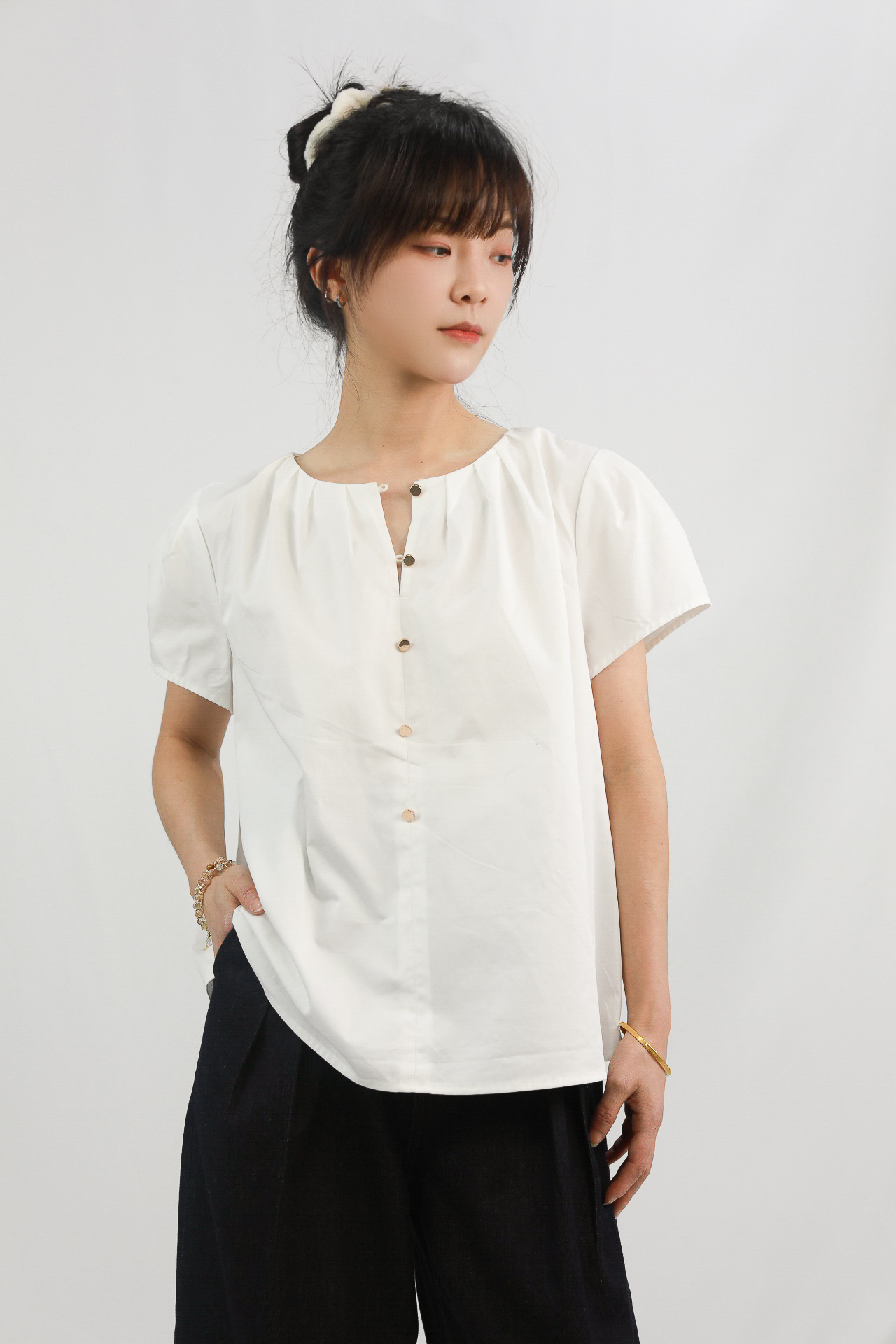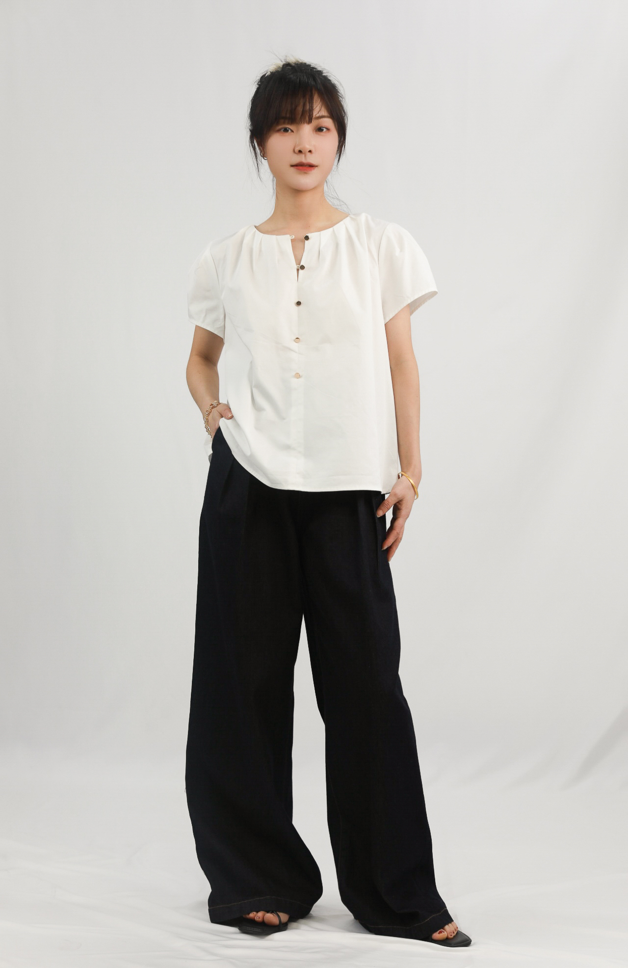 This is a white round neck short sleeved top with a French retro style, featuring a simple yet detailed design that is perfect for daily commuting or casual wear. From the front, it is decorated with a single row of metal buttons and has a slight pleated design at the collar, adding a soft and gentle touch; The back also retains the sharp lines of the round neck and short sleeves, and the overall cut is loose and comfortable, which can effectively enhance the body shape.