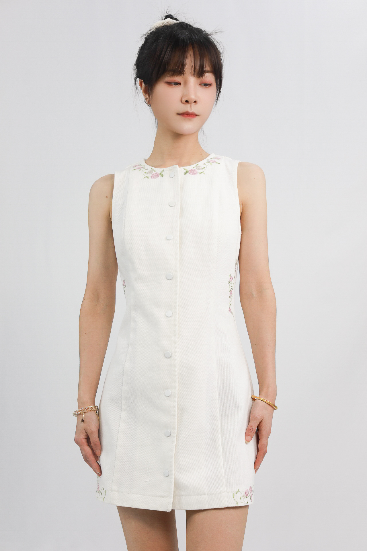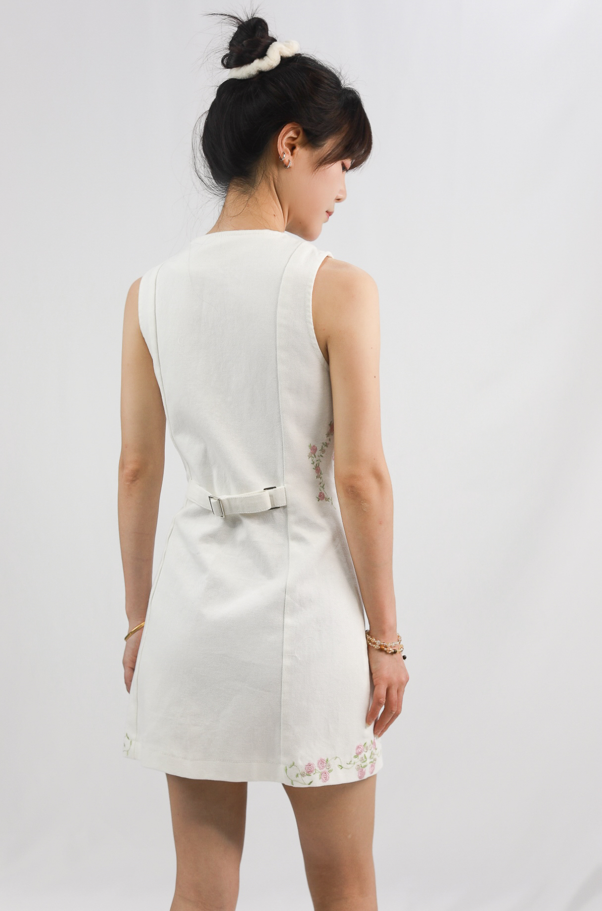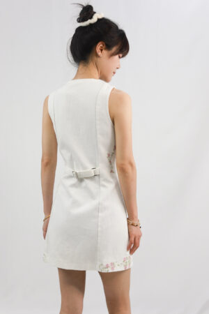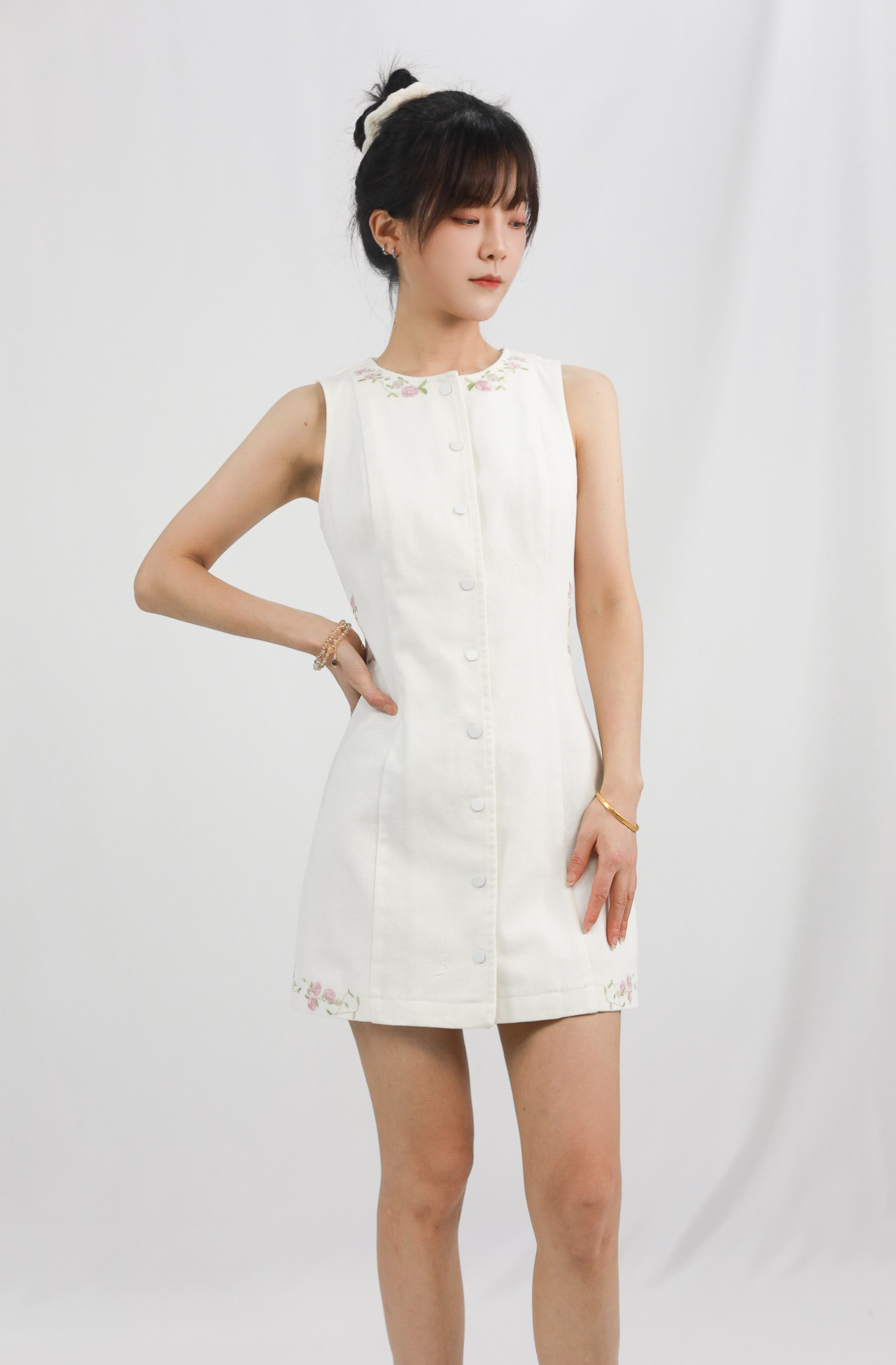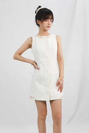 A sweet blend of vintage charm and modern simplicity, this sleeveless mini dress is a wardrobe staple for effortless feminine style. Crafted in soft ivory with delicate embroidered floral accents, it’s perfect for sunny days, picnics, or casual outings with a touch of grace.