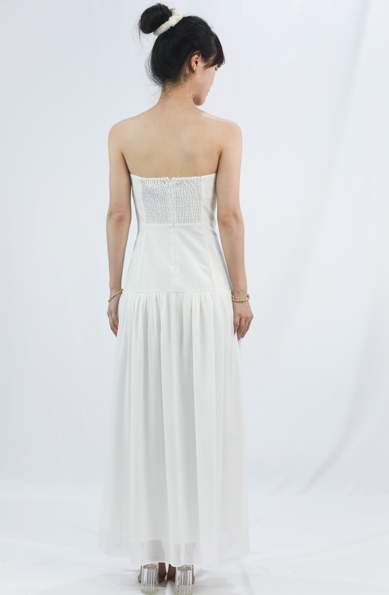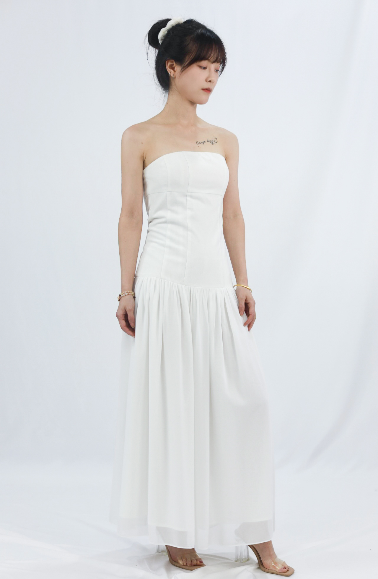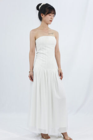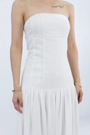 This strapless white maxi dress combines the timeless charm of a corset silhouette with a modern minimalist edge. Designed to celebrate the female form, it is both structured and fluid, making it a standout choice for special occasions or elegant everyday moments.
