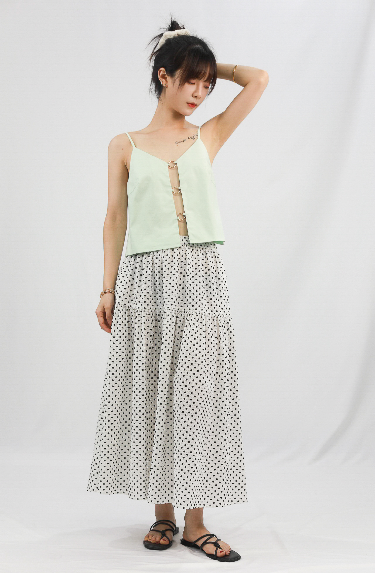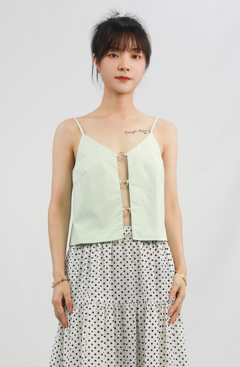 This light green camisole features a V-neck design and a metal ring decoration with a slit detail on the front, adding a sense of fashion. Adjustable straps, simple and flat back, slim fit but not tight overall, lightweight and breathable fabric, suitable for wearing in spring and summer seasons. Pairing with polka dot skirts or jeans can easily create a fresh and natural look.