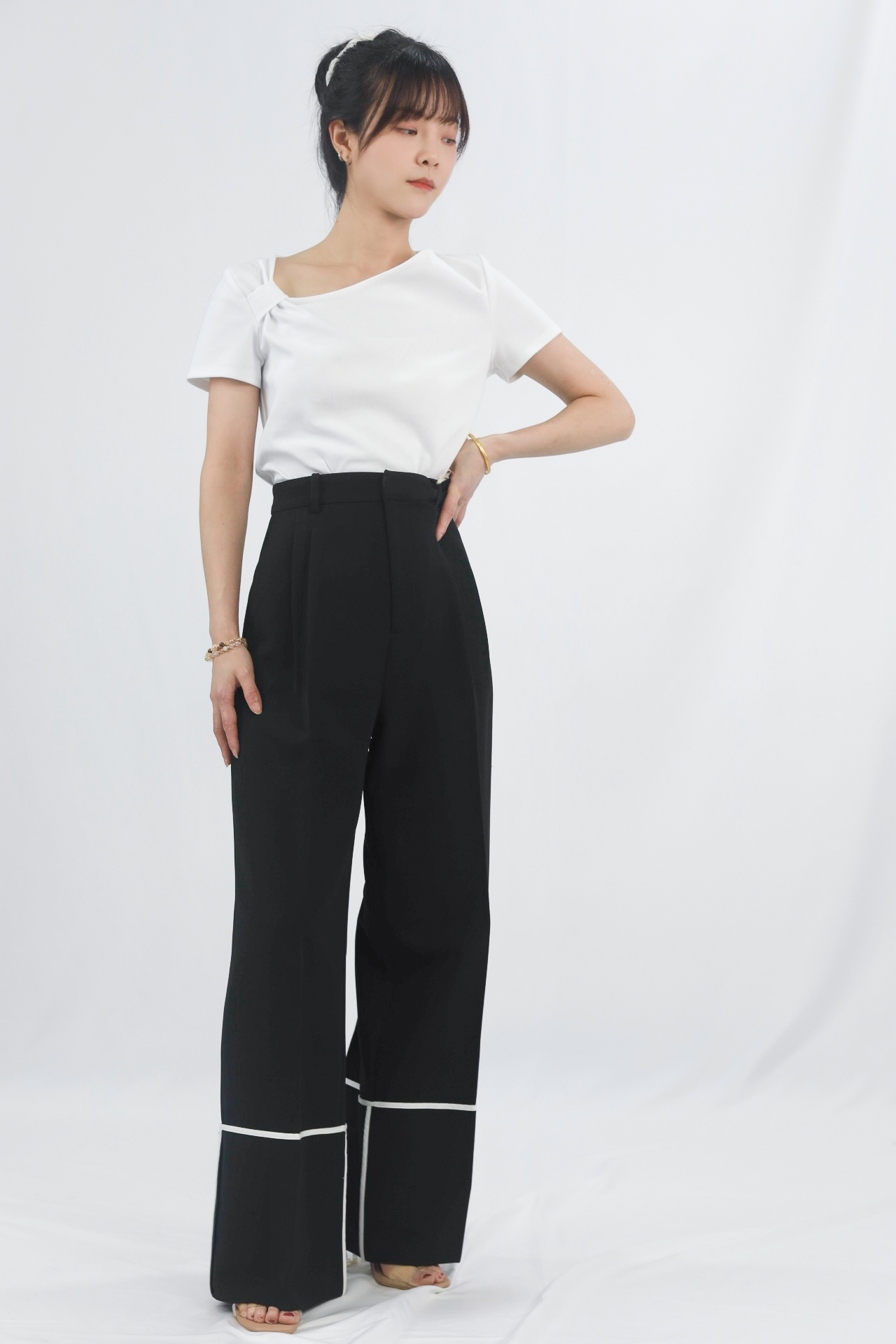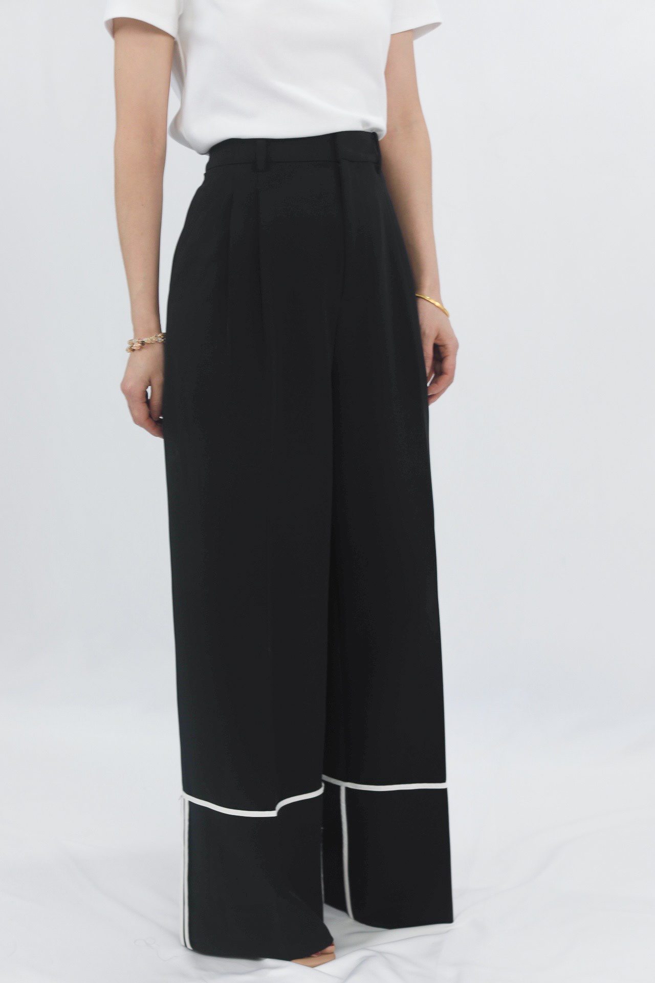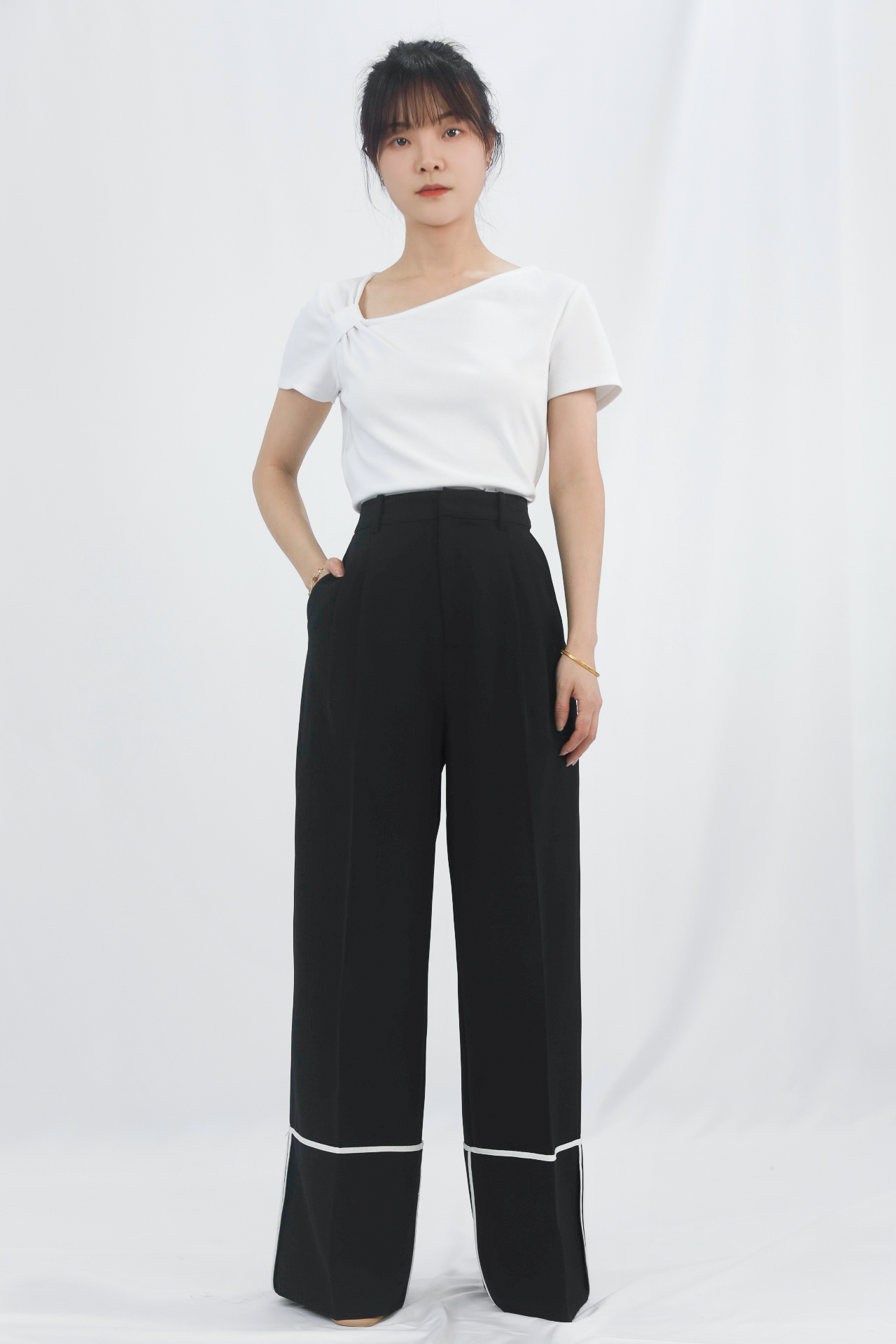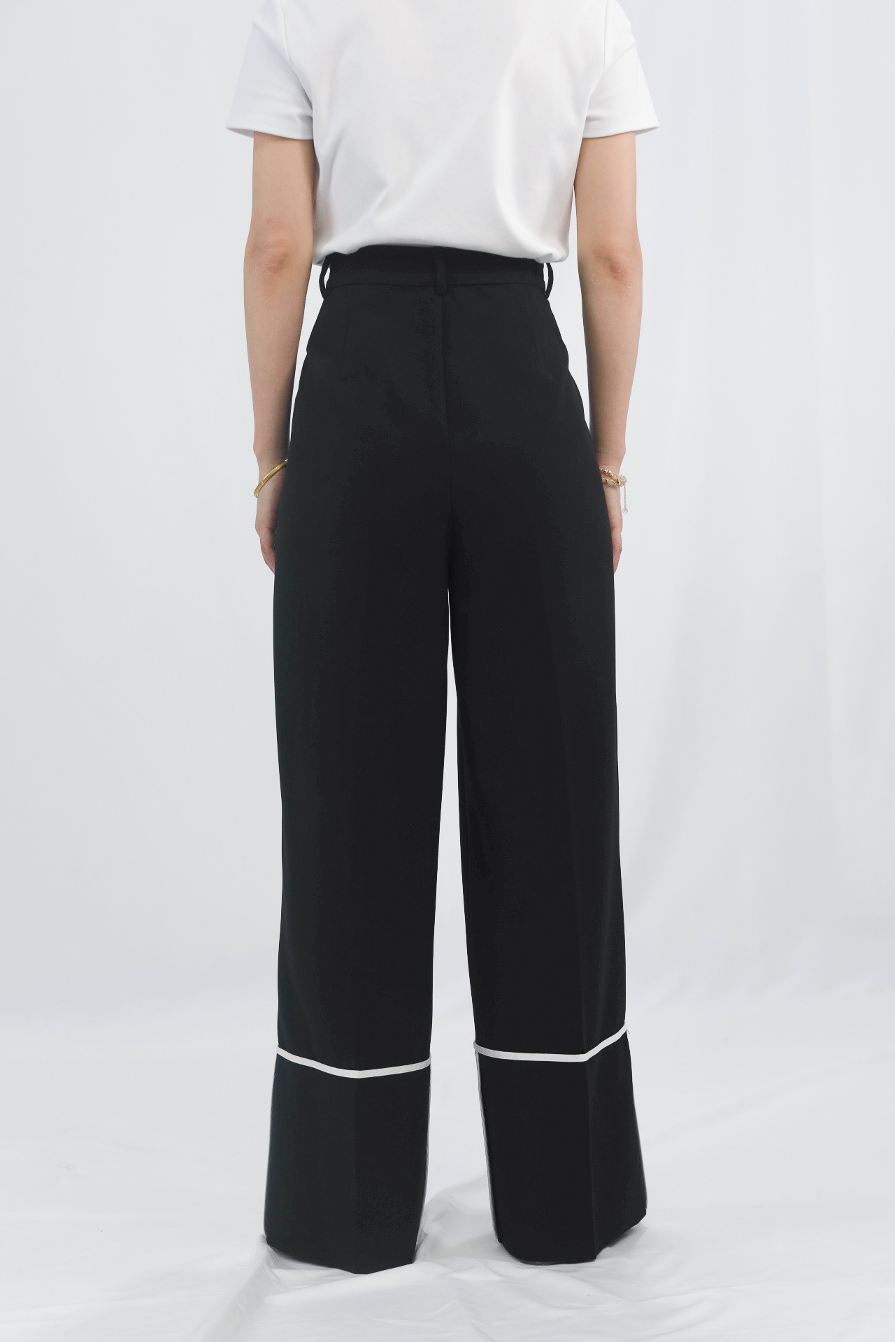 白色滚边细节:裤脚处的白色滚边是点睛之笔,打破纯黑的沉闷感,增添设计层次与时尚感,同时在视觉上形成“截断”效果,强化裤长。