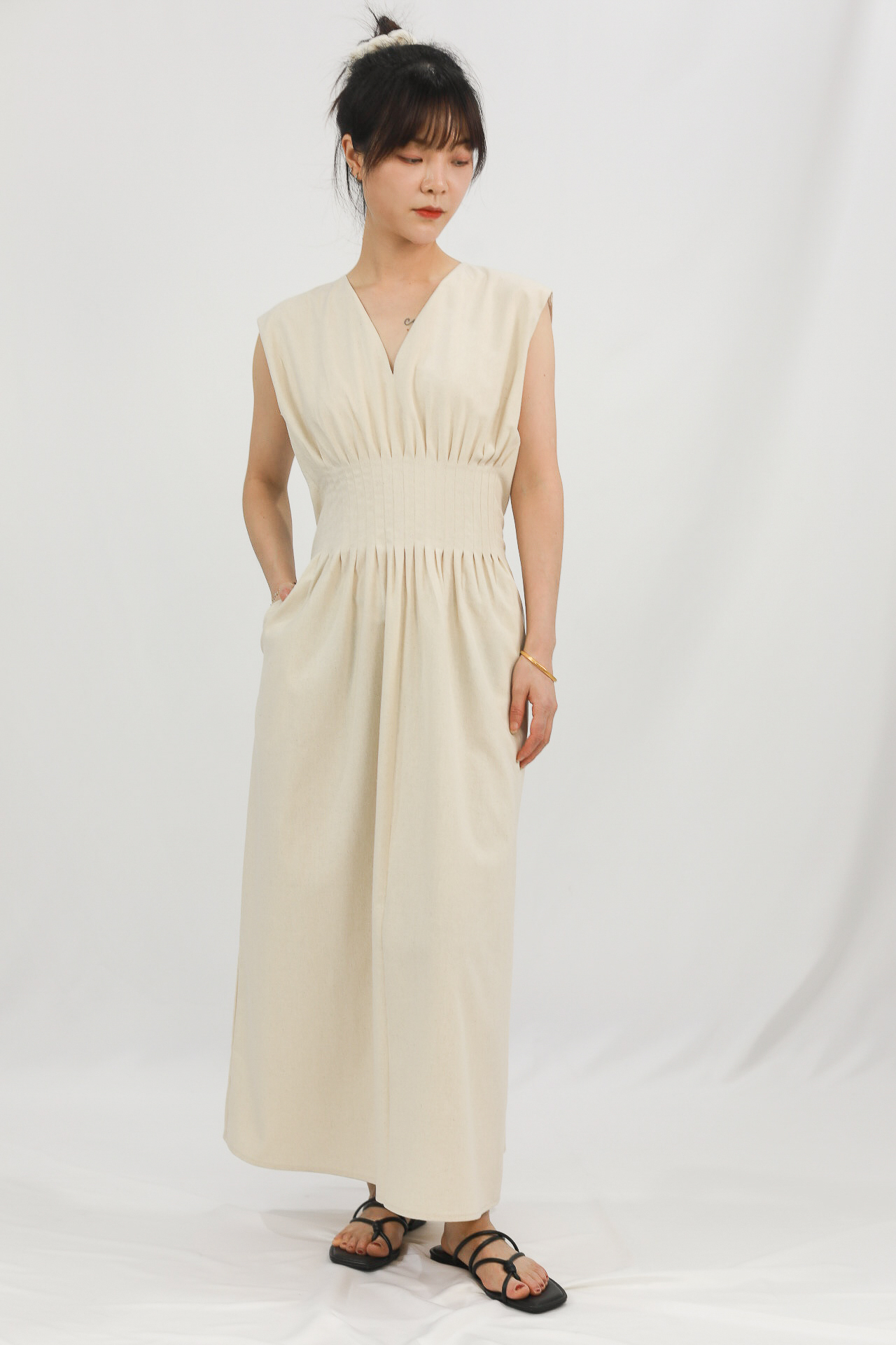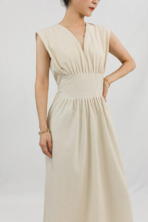 This elegant beige sleeveless jumpsuit enhances your summer wardrobe. This design features a deep V-neck and a wide waistband, providing comfort and flexibility while highlighting the waist. The fabric drape is beautiful, shaping a smooth contour and elongating the body. The wide leg design adds a touch of delicacy, while the lightweight material ensures excellent breathability, making it perfect for going out or relaxing in warm weather