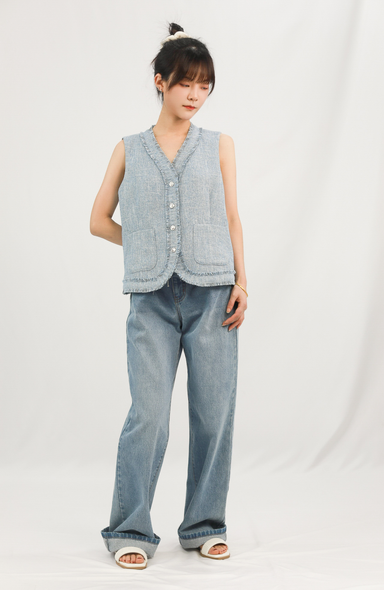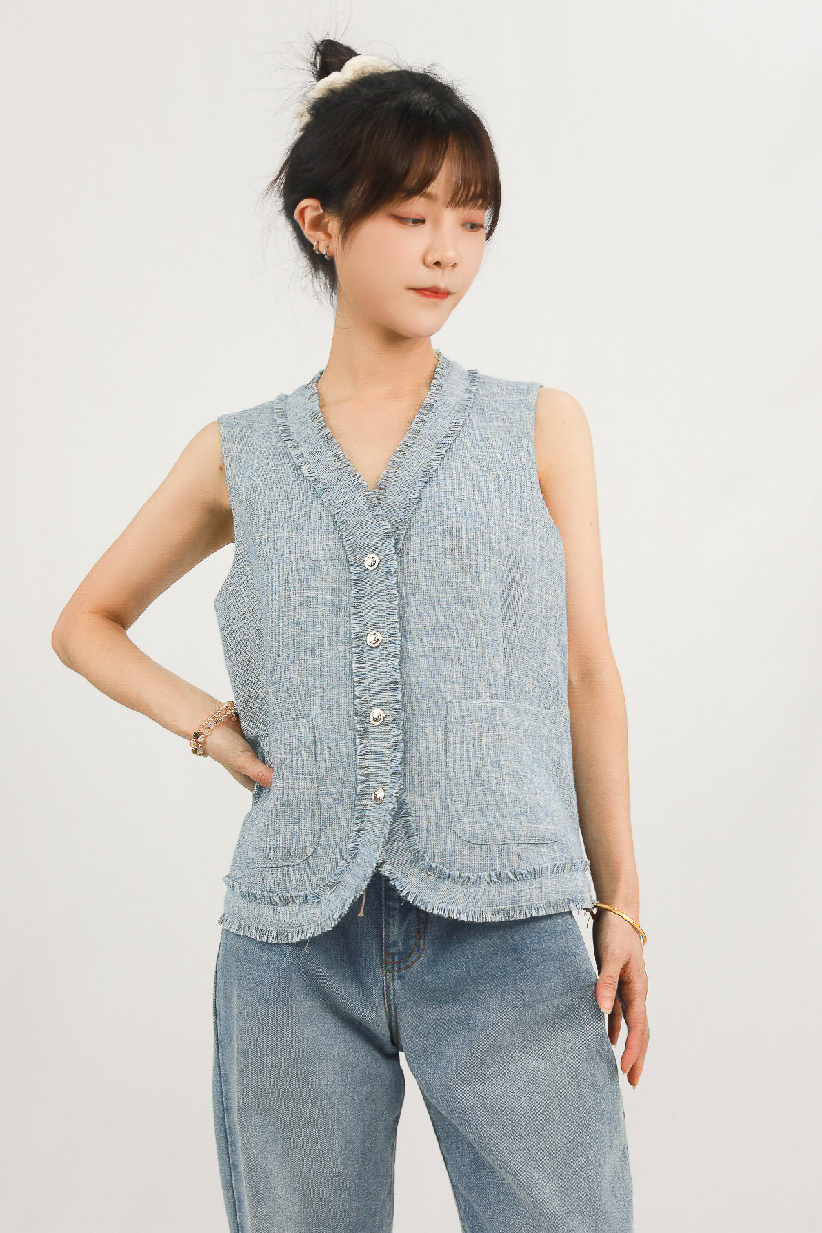 Elevate your casual wardrobe with the Vintage Chic Frayed Denim Vest, a modern twist on a timeless staple.Designed for comfort and effortless style, this sleeveless buton-down vest blends a laid-back denim feel with refinedtailoring. Whether layered over a tee or worn solo, it’s perfect for casual outings, brunch dates, or a relaxed day out.